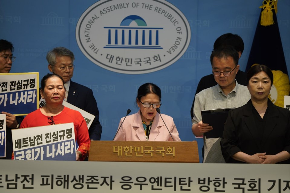 국회 기자회견에서 공동성명을 발표하는 하미 마을의 응우옌티탄(오른쪽)과 퐁니 마을의 응우엔티탄(2025년 6월)[/caption]
